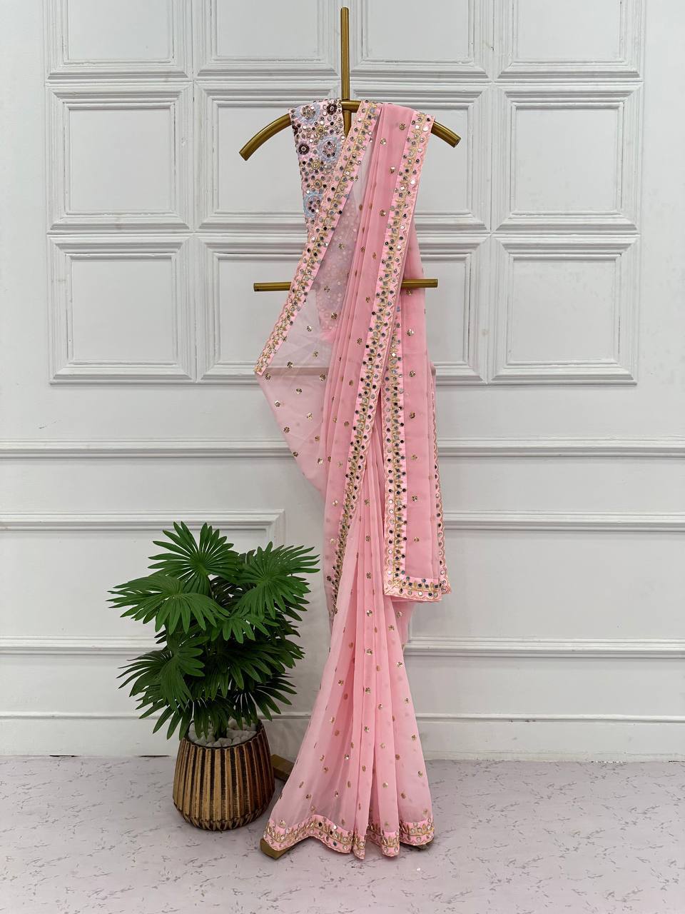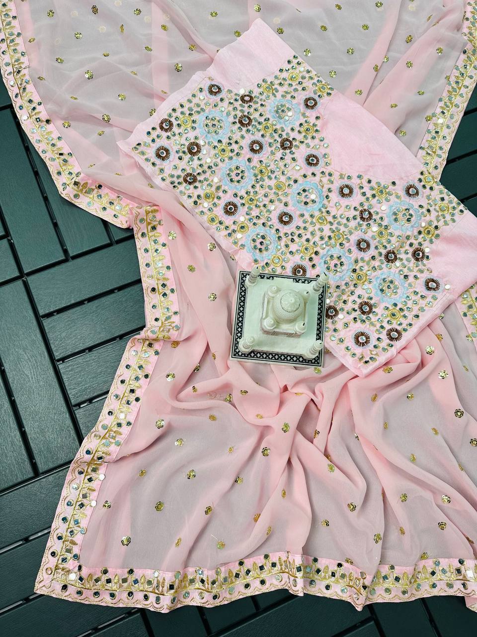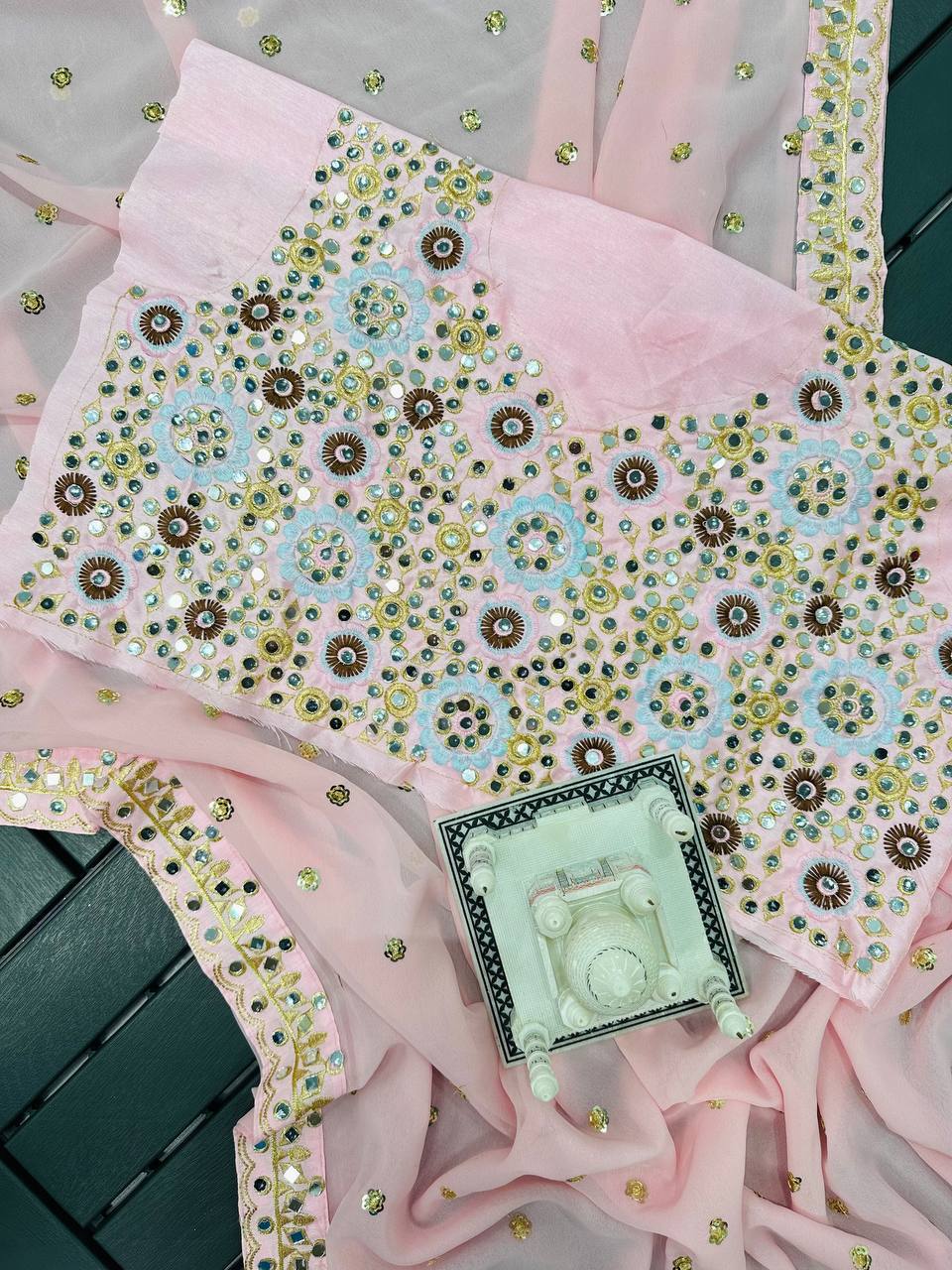 - This stunning saree is inspired by the glamorous outfits worn by Khushi kapoor, a popular bollywood actress. The saree is made of georgette, a light and flowy fabric that gives a graceful look. The saree has an embroidery design work with real mirror lace work, which creates a dazzling and intricate pattern on the fabric. The saree is 5.5 meters long, and can be draped in various styles.