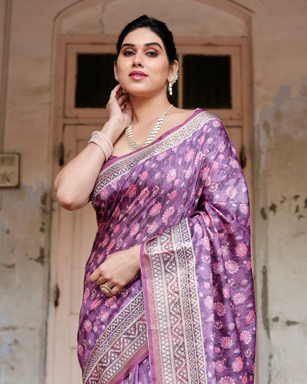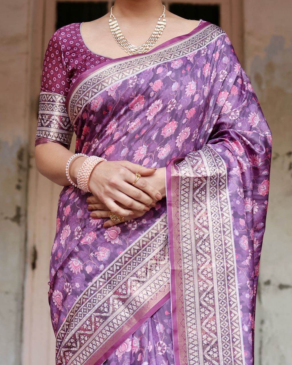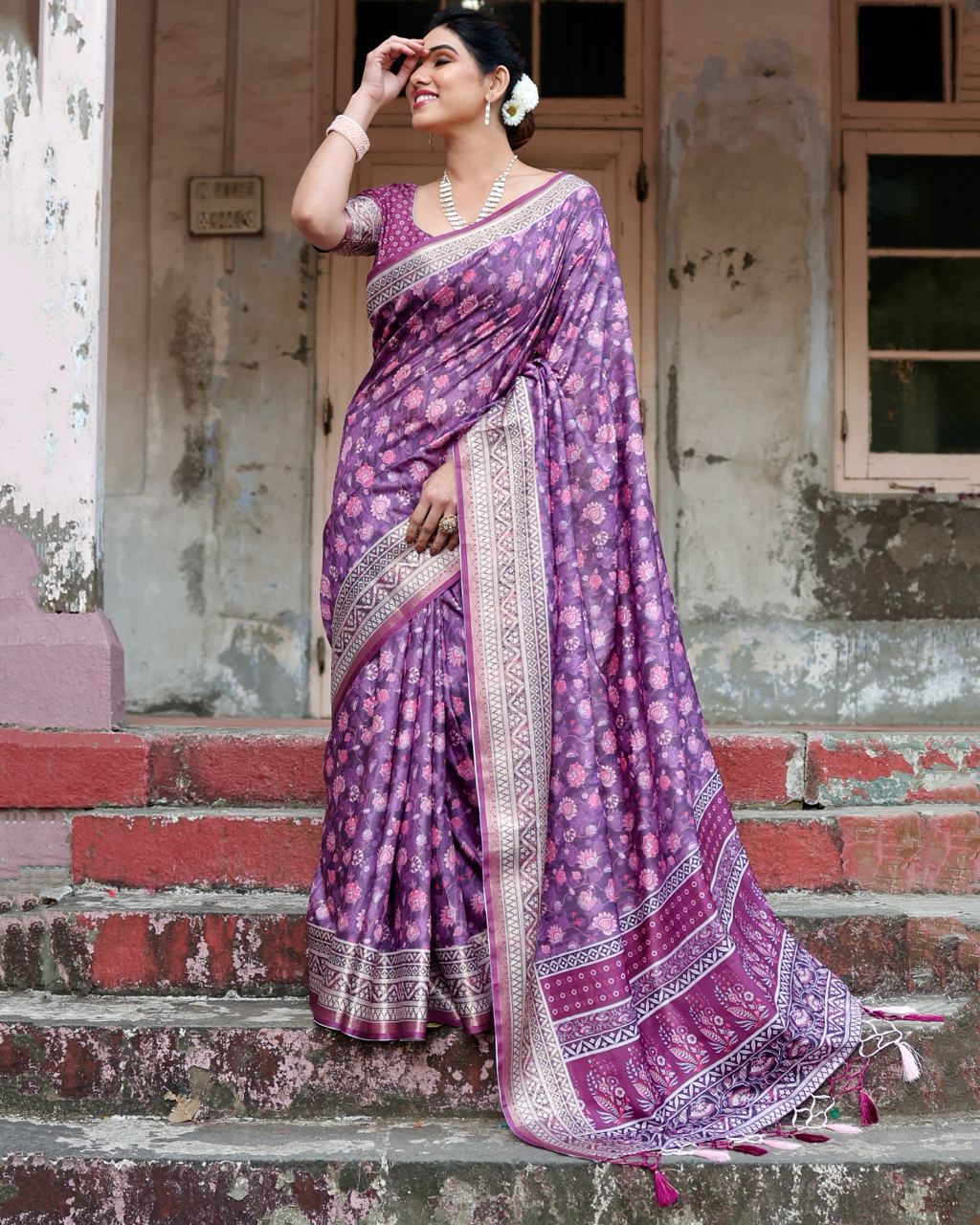 Be the first to review “Pure Silk Saree With Digital Print and Blouse in Purple Indian Silk Saree”