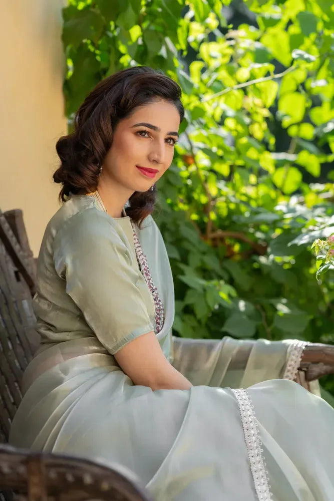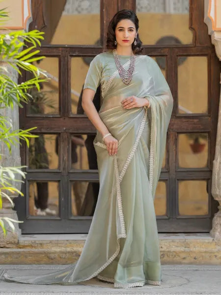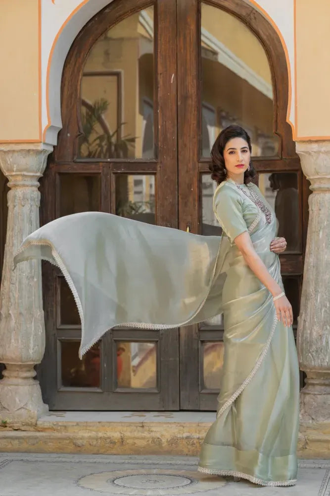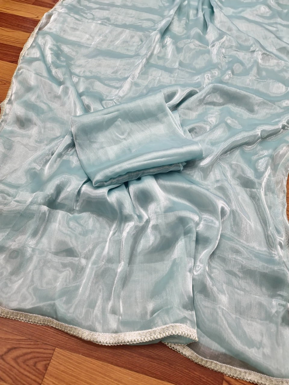 Fabric pure Jimmy chu silk with elegent heavy lace border with heavy pure Jimmy chu self blouse