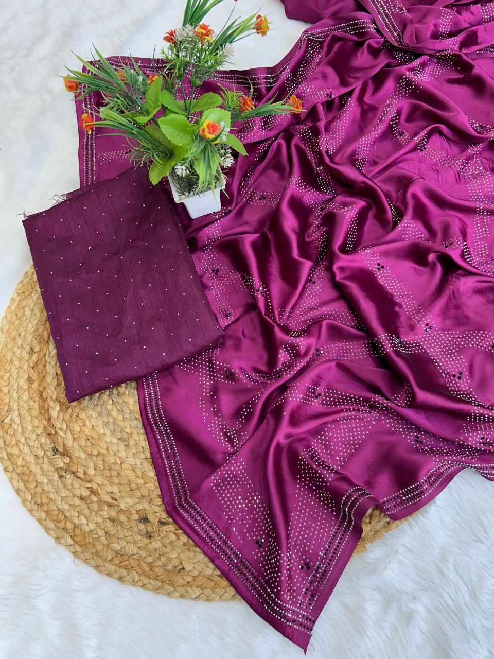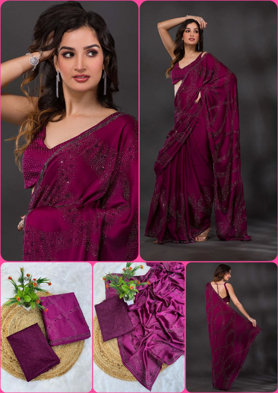 Order this Wine Swarovski Semi Crepe Designer Saree today and get ready to dazzle everyone with your grace and beauty. This saree is available at an affordable price and comes with free shipping and cash on delivery options. Hurry, limited stock available!